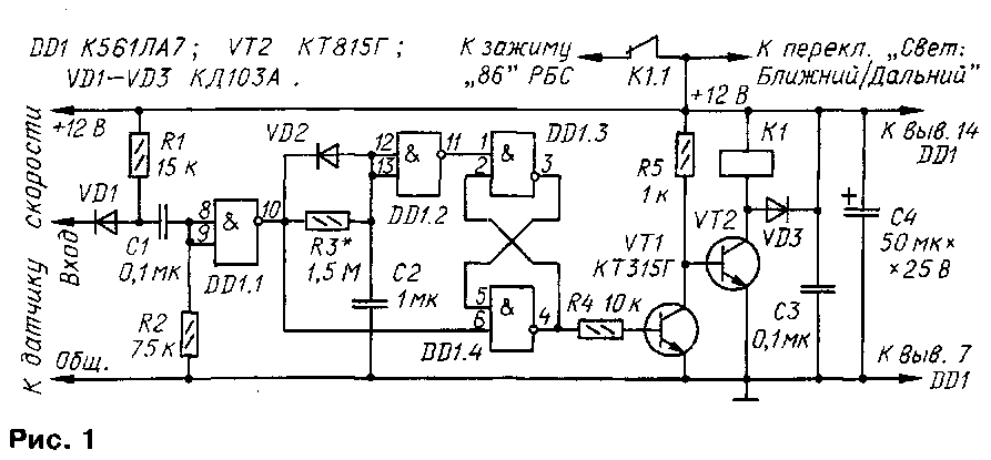 | Короче сам спросил, сам ответил Задержка отключения задается элементами С2 и R3, (величина R3 влияет на скорость заряда кондера, ну а емкость самого кондера естественно влияет на время его заряда), посему я бы увеличил задержку отключения......логичней и проще это сделать наверное просто увеличив емкость кондера, хотя может и параллельно с сопротивлением тоже можно поиграться. Как мне кажется пусть там даже в 30-40 секунд будет задержка (с учетом средних величин работы светофоров), ничего страшного, все одно ИМХО здесь больше важно не так отключение при остановке, как именно включение при начале движения.