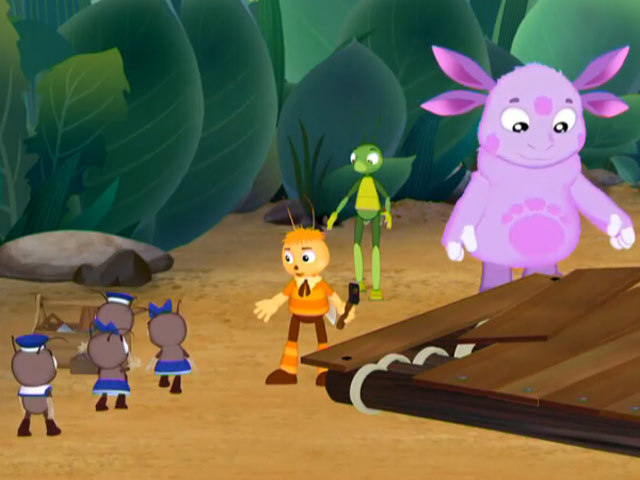 Лунтик, Кузя и Пчеленок строят плот. Им помогли жучки. Но после первых испытаний оказалось, что ребята сделали паром.