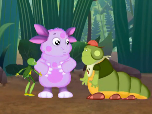 Что это сделалось с Пупсенем? Выскочил из тенька перекошенный от ужаса! В травяные заросли отправляется Кузя — и тоже возвращается в смятении. И вот что еще странно: каждый видит разное, и непонятно — Кривая Гусеница там, Кузнечик с Огромными Глазищами или Жуткий Пчеленок. Но стоило друзьям раздвинуть траву, как солнце осветило капли, висящие на травинках. Получилась настоящая комната смеха!