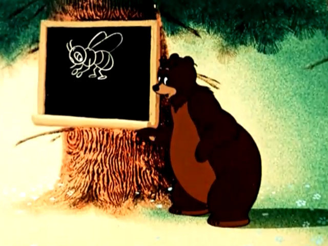 Медведь-учитель, рассказывает медвежатам о пользе и вреде пчел.Режиссер: Л. Бредис.