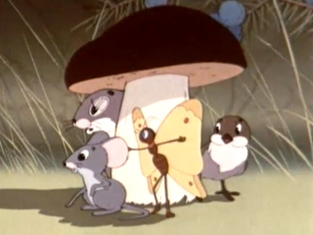 Застигнутые грозой муравей, бабочка, мышка и воробей, находят убежище под грибом. Во время дождя гриб подрастает, поэтому друзья укрывают и зайчонка от преследований лисы. Режиссер: В. Полковников.