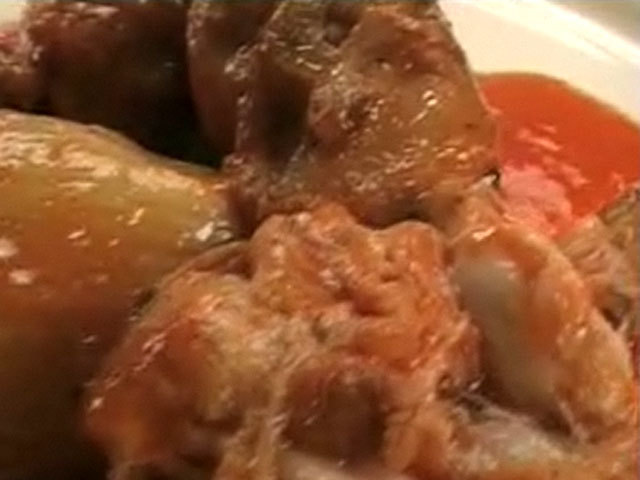 Рецепт приготовления мяса кролика.Состав:мясо кролика, белое вино, томатная паста, масло, соль, перец, шампиньоны, лук, чеснок.