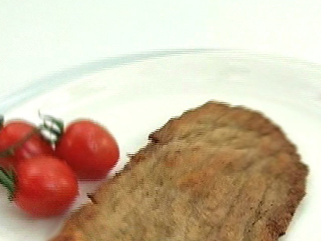 Блюдо из нежной телятины, панированное сухарями.Состав:телятина — 1 кусочек;яйцо — 1 штука;панировочные сухари, соль, оливковое масло.