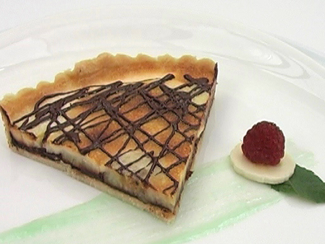 Только качественный шоколад для правильного пирога.Состав:банан — 1 штука;шоколад — 140 гр;сахар — 40 гр;сливки — 3/4 стакана;яйца — 3 штуки;простое тесто — 1 порция.