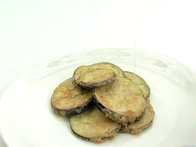 Горячая закуска из баклажан с медом.Состав:баклажан — 1 штука;яйца — 2 штуки;мука — 50 гр;мед, подсолнечное масло, соль.