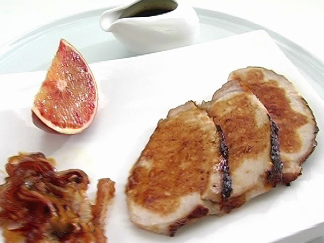 Горячее блюдо для любителей прожаренного мяса.Состав:свиное филе — 0,5 кг;сок шести апельсинов;сакэ — 50 гр;лук — 2 штуки;мед — 2 столовых ложки;оливковое масло, соль — по вкусу.