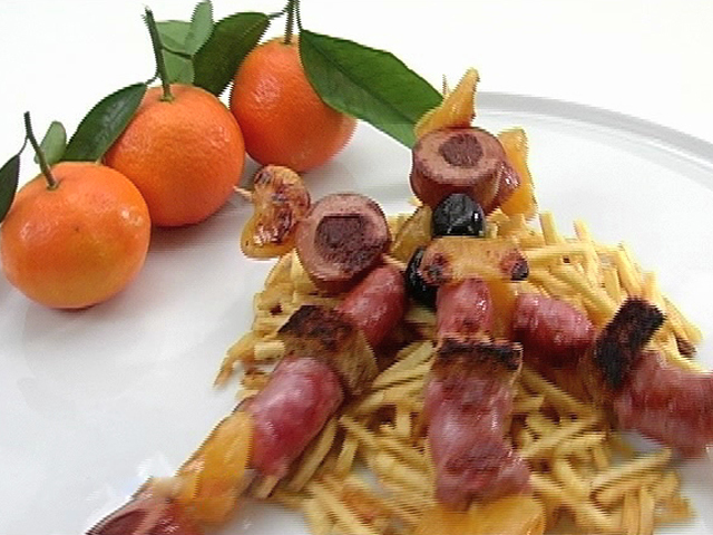 Хорошая закуска для субботнего ужина.Состав:колбаски из утки, колбаски из курицы, колбаски из свинины — 400 гр;мандарины — 2 штуки;оливки — 8 штук;цельнозерновой хлеб — 2 кусочка;фри — 1 порция;оливковое масло по вкусу.