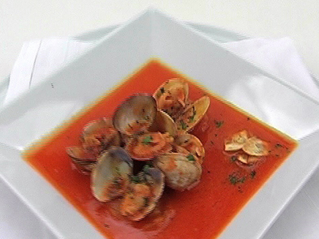 Вкусная и полезная похлебка из моллюсков.Состав:моллюски — 300 гр;томат — 150 гр;вода — 100 гр;сухое вино — 40 гр;чеснок — 1 зубчик;хлеб — 4 дольки;оливковое масло, соль, черный перец, паприка — по вкусу.